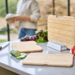 Having multiple boards on hand is convenient, but storage can be a challenge. This set of three bamboo chopping boards is housed in a sleek stainless-steel case, keeping your worktop neatly organised. Each board is crafted from bamboo which naturally makes a tough cutting surface, whilst the addition of non-slip feet makes for secure chopping.
